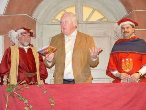 Amüsiert folgten Regierungspräsident Gerold Dieke, Landrat Horst Schnur, Bürgermeister Gerd Lode sowie viele Vertreter von Geldinstituten, Unternehmen und Vereinen im Odenwald den launigen Vorführungen und Erzählungen. Tamino der Gaukler alias Jens Räthel hat nicht nur Taschenspielertricks im Repertoire, er kann auch mit der Nase zwei Blockflöten Melodien entlocken. Marktleiter Rolf Tilly und Silvia Seidel stellten in groben Zügen den geplanten Ablauf des diesjährigen Mittelalterlichen Spektakels vor, soweit es die Künstler betrifft. Jochen Rietdorf informierte über den Ablauf der Lesungen und Theateraufführungen.